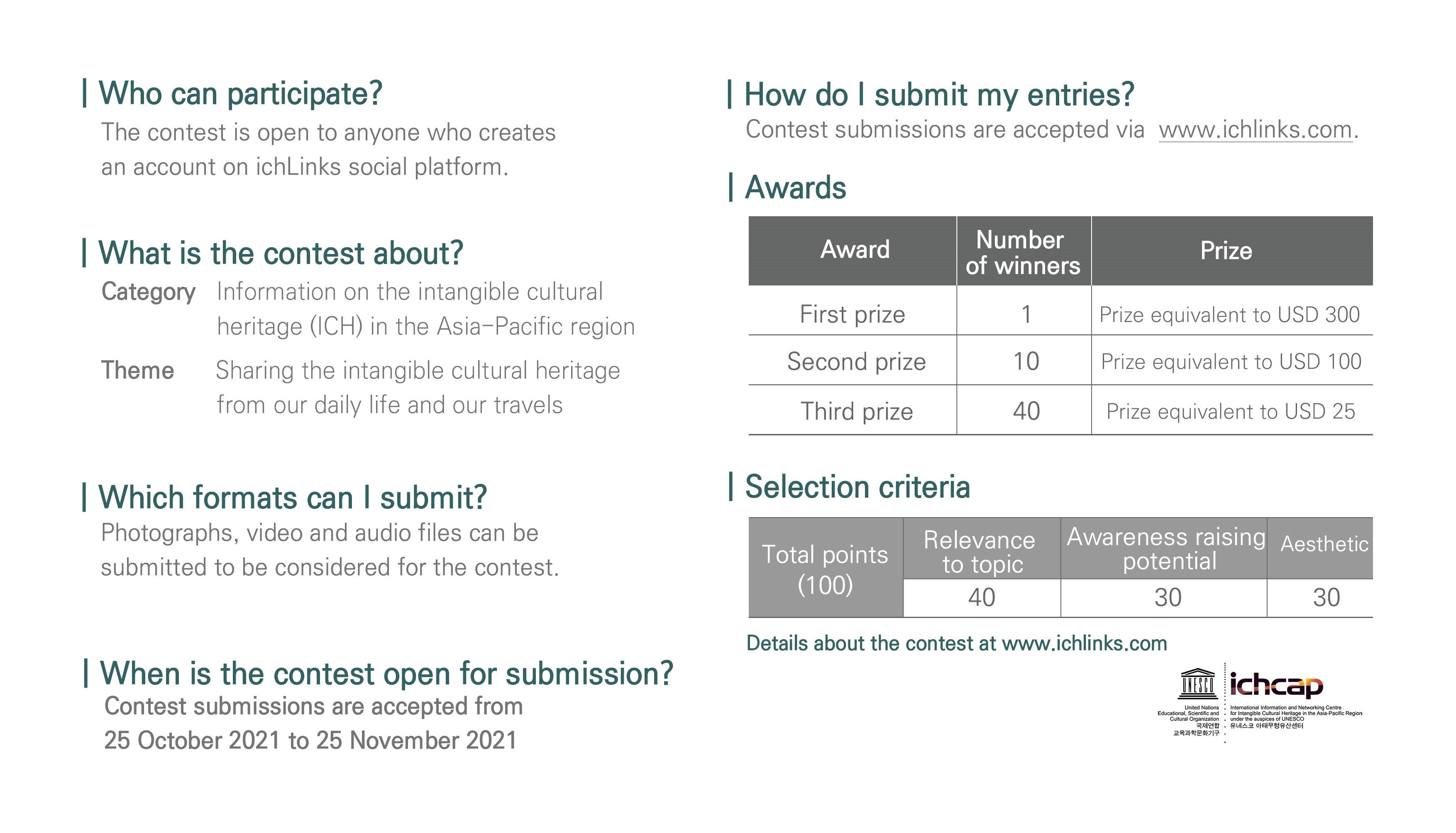 ICHCAP expects that the contest will help raise public awareness of ICH in their daily lives, which leading ICH safeguarding.
